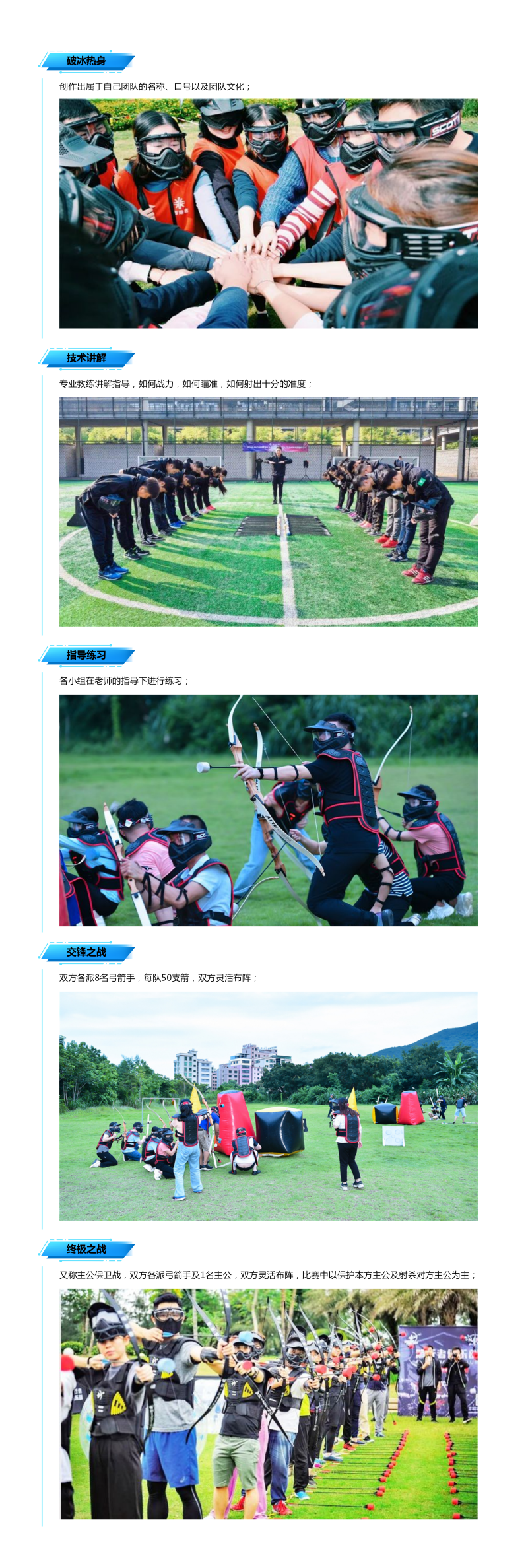 一款在美国风靡的射箭运动,是射箭与野战运动的混合版,可训练个人能力和团队精神。包含WARGAME的紧张和闪避球的刺激,以独特的弓及专利设计的泡沫箭,为大家带来刺激而且兴奋的项目体验。