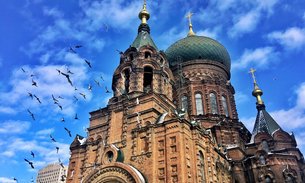 始建于1907年的圣索菲亚大教堂是哈尔滨的地标性建筑,绿色的洋葱头式大穹顶十分引人注目。