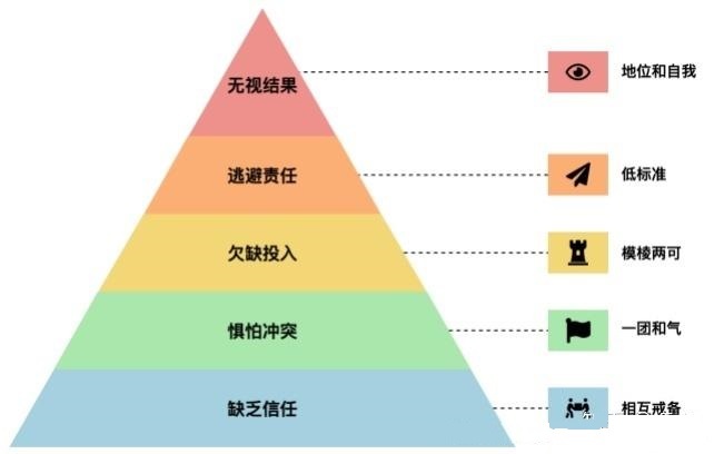 组织的高效运营必须领导者与团队成员之间紧密配合完成,因此想要组织顺利前行,达到理想的彼岸, 必须破除团队协作的五项障碍:缺乏信任,惧怕冲突,欠缺承诺,逃避责任和无视结果。