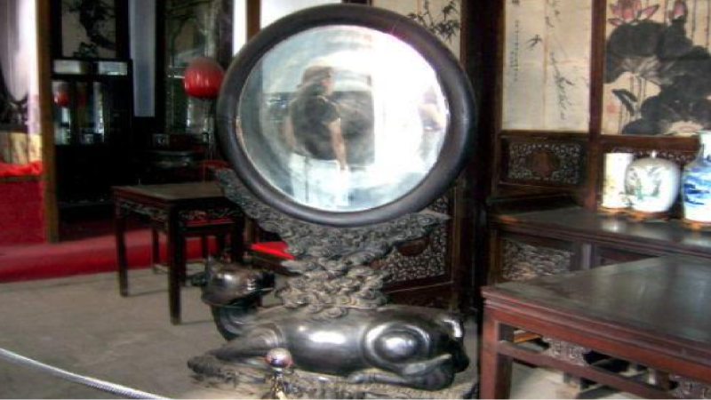 犀牛望月镜是一面直径有一米左右的镜子,镜架镜框为木质最坚硬的珍稀树木铁力木所制。是国家的一级文物,同时也是乔家的镇宅之宝,整个宝贝由三部分组成,上面是镜子代表圆圆的月亮,中间是祥云,底座是犀牛,因此叫“犀牛望月镜”。犀牛望月镜造型独特,样式美观,既有实用价值,又有观赏价值,堪称为稀世之珍品。