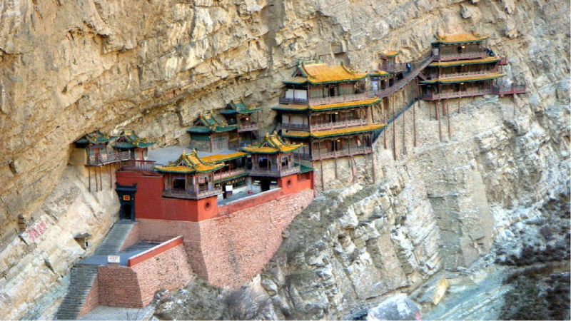 位于山西省大同市浑源县恒山金龙峡西侧翠屏峰峭壁间,原叫“玄空阁”,“玄”取自于中国道教教理,“空”则来源于佛教的教理,后改名为“悬空寺”,是因为整座寺院就像悬挂在悬崖上,在汉语中,“悬”与“玄”同音,因此得名。建成于公元491年,是佛、道、儒三教合一的独特寺庙。“悬空寺”建筑极具特色,以如临深渊的险峻而著称,素有“悬空寺,半天高,三根马尾空中吊”的俚语,以如临深渊的险峻而著称。