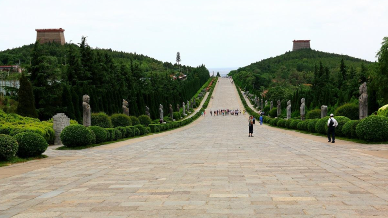 陵区气势雄伟壮观,最引人注目的是朱雀门外的石人群像,整齐恭敬地排列于陵前,仿佛列队恭迎皇帝的到来。