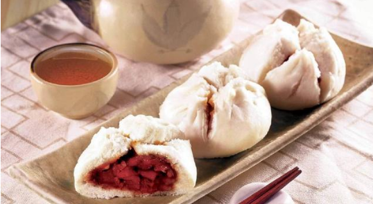 这是广州人喜爱的大众化点心,广式早茶的四大天王之一。叉烧包的面皮是用北方常用的发酵面团经过改进而成的。包制时要捏制成雀笼形,因为发酵适当,蒸熟后包子顶部自然开裂,实际上是一种带有叉烧肉馅的开花馒头。叉烧包稍微裂开露出馅料,渗发出阵阵的叉烧香味,让人垂涎欲滴。