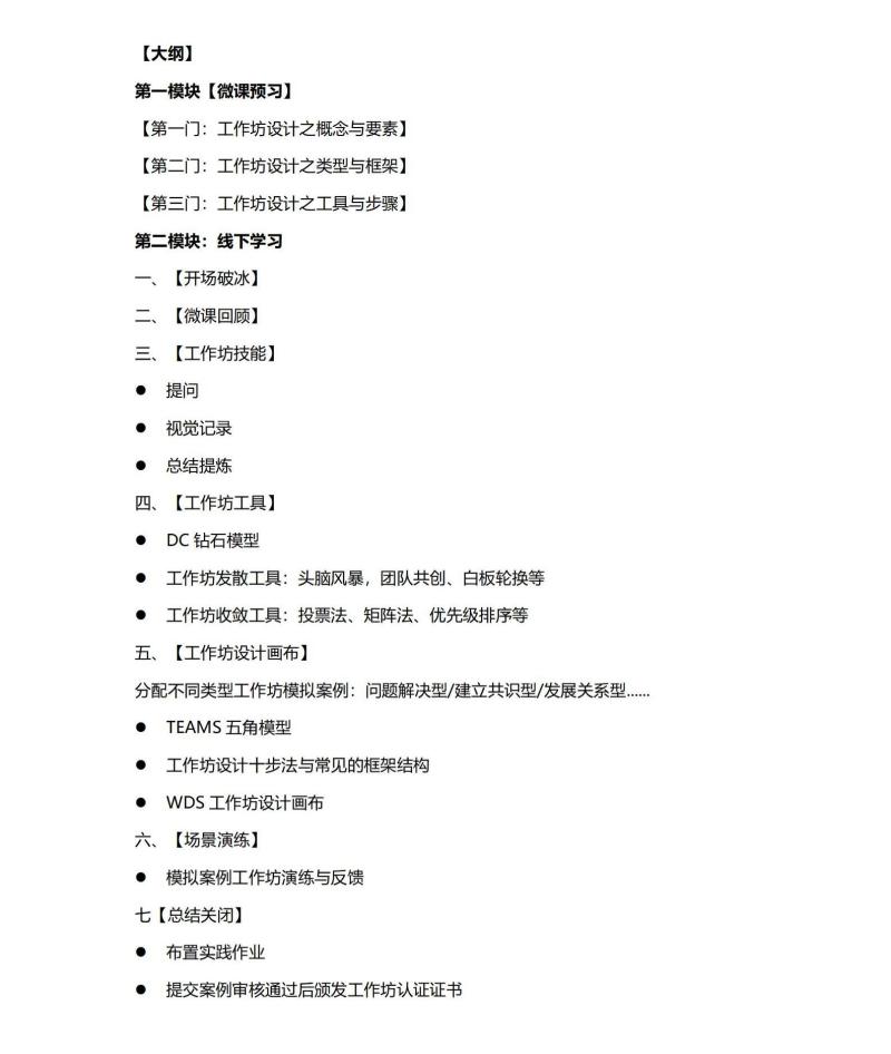 《工作坊赋能认证》包含概念、能力、工具、设计、演练,打通工作坊设计全流程,可以帮助专业工作者有效提升工作坊实操的能力。