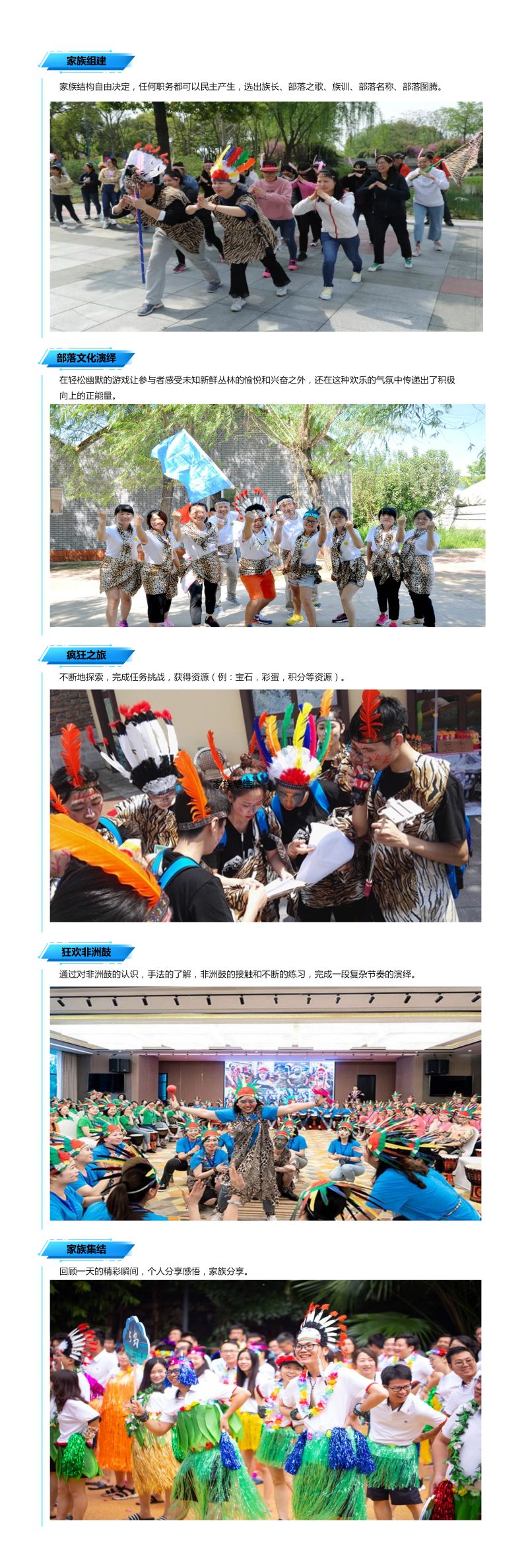 本课程所有环节都通过情境的引导、融合学员们的创造力、表现力、展现团队的多姿多彩、齐心合力的一面,精心设计的情境为学员创造激动人心和终生难忘的学习体验;对未知的好奇,是人类的本能对未知的探索,让人类勇敢的选择;让我们一起穿越回到原始社会组建不同的部落,随着生活的发展改善自己的部落家园,也同时人们需要守护与入侵者进行对抗,并最终达成联盟进行各自文化的传承,一起载歌载舞。