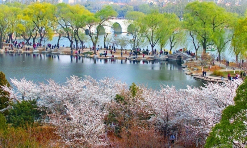 初春的颐和园桃红柳绿、湖光山色,西堤六桥与1800余株山桃相映衬,人在景中走,如同画中游。