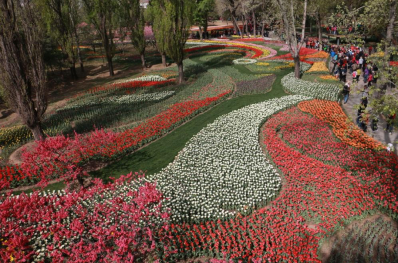 北京植物园有100余个品种、20余万株郁金香,如同一个巨大的调色板,展现了花海似锦的景观效果。