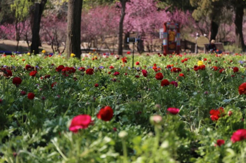香山公园有8000株、近400平方米的花毛茛,红、粉、黄、白,各种颜色十分艳丽,体现了香山山花烂漫的景观特点。