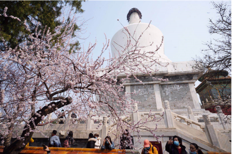 北海公园琼华岛景区,20余株山桃近日已迎来盛花期,簇簇粉花与巍峨白塔掩映,呈现古建筑与自然的完美结合,引得众人纷纷打卡留影。
