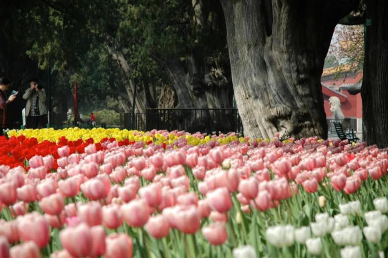 中山公园的郁金香也极具特色,栽种历史可追溯到上世纪70年代,栽植有20余万株、90余个品种,是北京城中心区最佳的郁金香观赏地,七彩的郁金香融合中国传统古建古树,极具韵味。今年公园以“锦鲤送福”为主题进行郁金香花卉展示,体现了欢乐祥和、吉祥如意的主题和美好寓意。