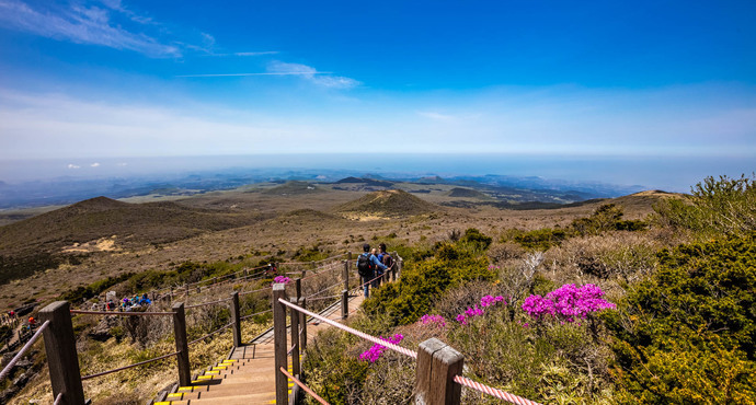 汉拿山位于济州岛中央,海拔1950米,呈东西走向,南山陡峭而北山平缓,山顶上是火山喷发形成的白鹿潭。是韩国最高的山峰。这座休眠火山有着十分独特壮观的景色,随海拔升高垂直分布着从亚热带到寒带的数千种动植物,堪称一个生态王国。有火山、河川、湿地、冰缘、风化侵蚀等地形地貌,周围的侧火山多达360个之多,其中土赤岳、砂罗岳、城板岳、御乘生岳最富代表性。