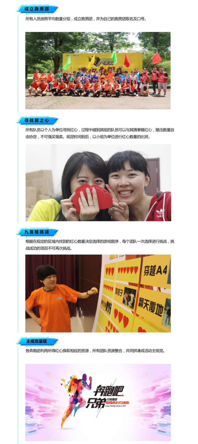 奔跑吧-兄弟之《红心大战》通过在景区或度假村内完成不同的任务闯关,过程中利用红心作为筹码,定向进行任务挑战,获取更多的红心,并用赢取的红心来换取企业拼图,共同拼出活动主视觉,整个活动用新鲜玩法刺激个体和团队荣誉感,最终全方位打开团队