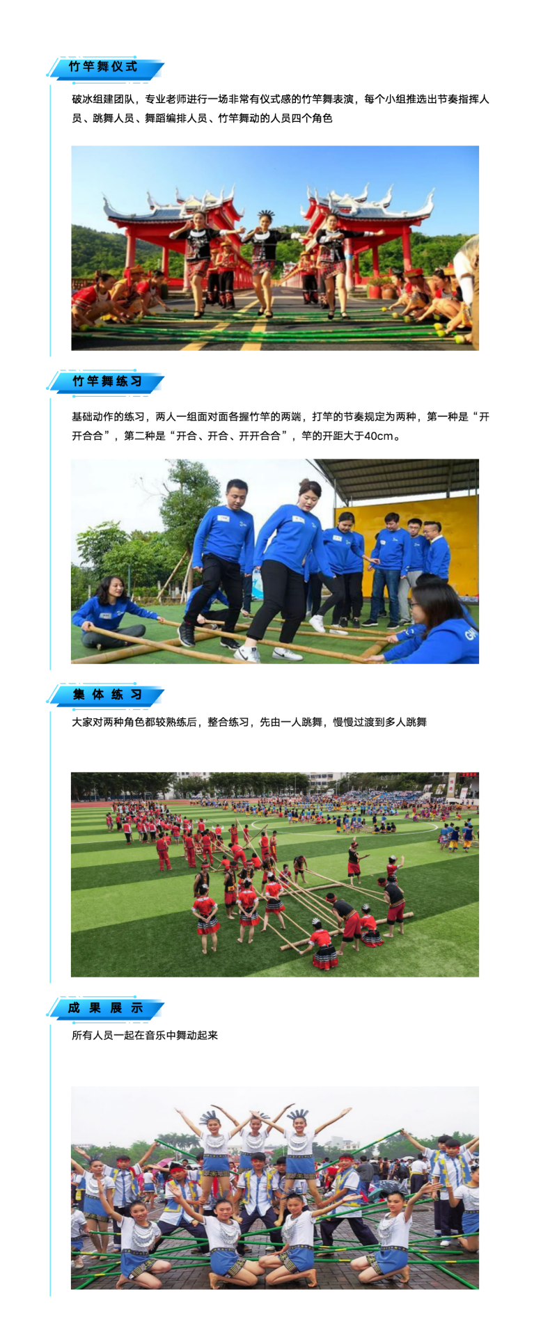 3,在有限时间内完成一部辉煌而富有激情的团队竹竿舞,从而达到体验舞蹈、体验节奏、体验快乐、体验团队的目的
