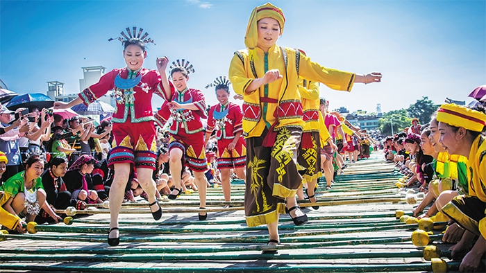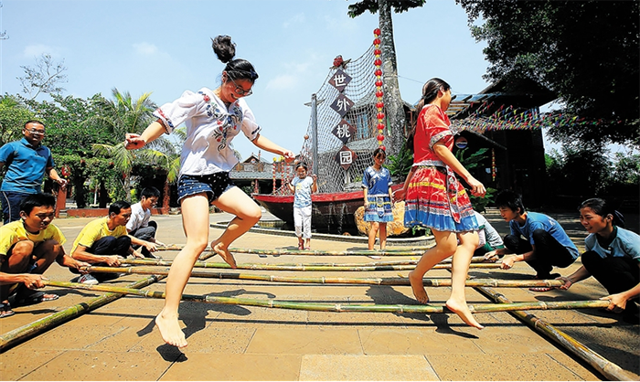 竹竿的缝隙里翻飞、跳跃,潇洒自然,演绎出美丽的舞姿,展示新颖、别具风韵的竹竿舞表演和人们载歌载舞,欢天喜地的心情,把人们带到了一个安祥欢乐,吉祥如意、团结凝聚的境地,这是一个个人挑战与团队协作结合的项目,伴随着愉快的音乐,让比赛化于无形,为了共同的目标,竹竿舞带你体验完美团队的合作魅力。