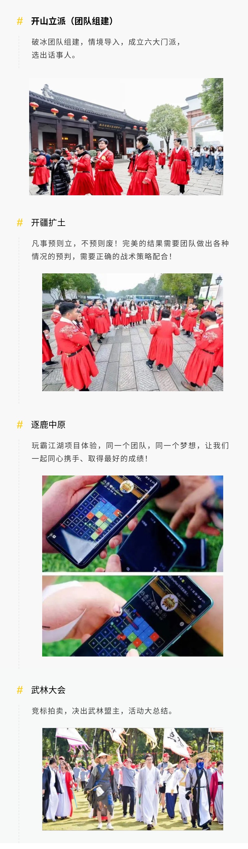通过武侠江湖的故事背景,COSPLAY乔装打扮,与现代科技相结合,将荧幕上的电影情节直接带到现实挑战中,让你有机会“一统江湖”还能让你有最真实的代入感。瞬息万变的战局中团队策略的调整、角色的合理分配、资源的整合都将是成功的关键。