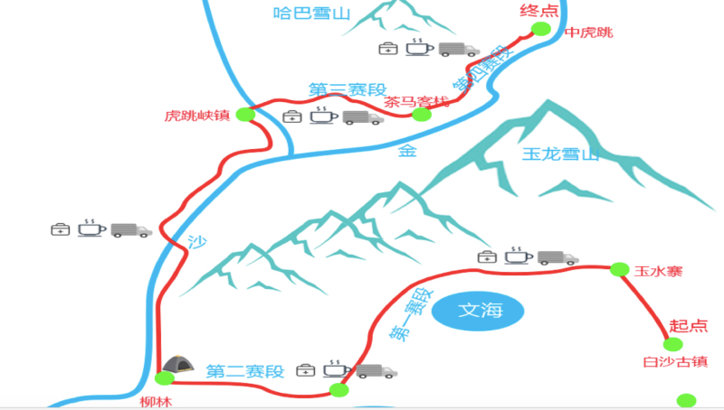 白沙古镇-文海营地-江边柳林营地-茶马客栈-中虎跳峡